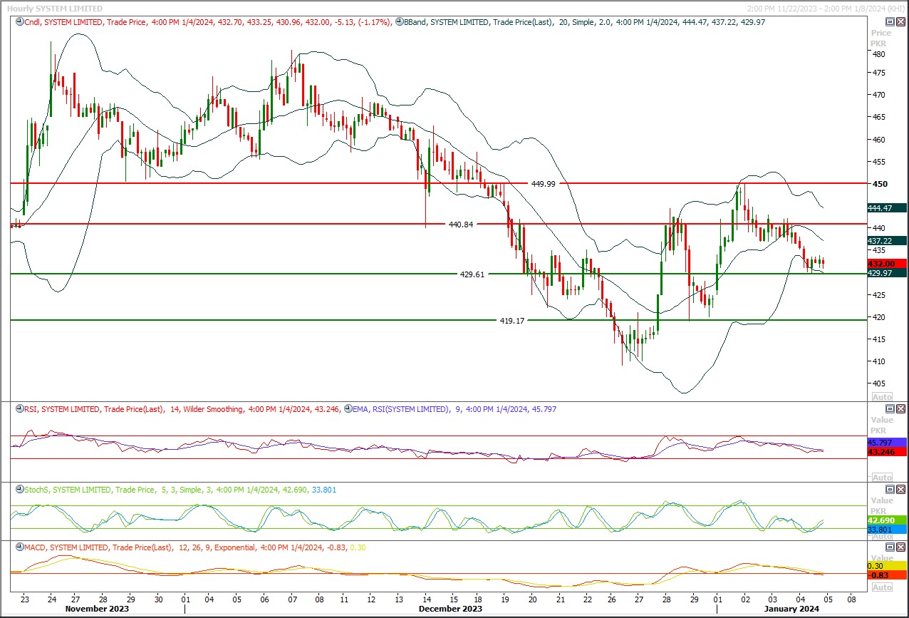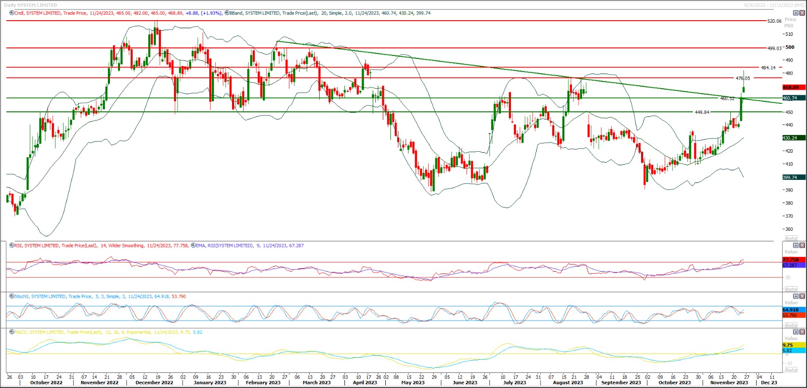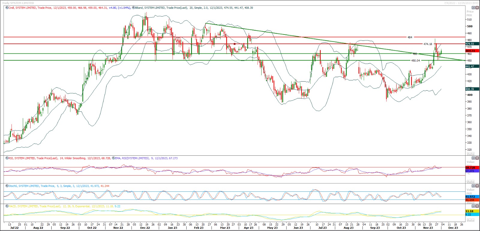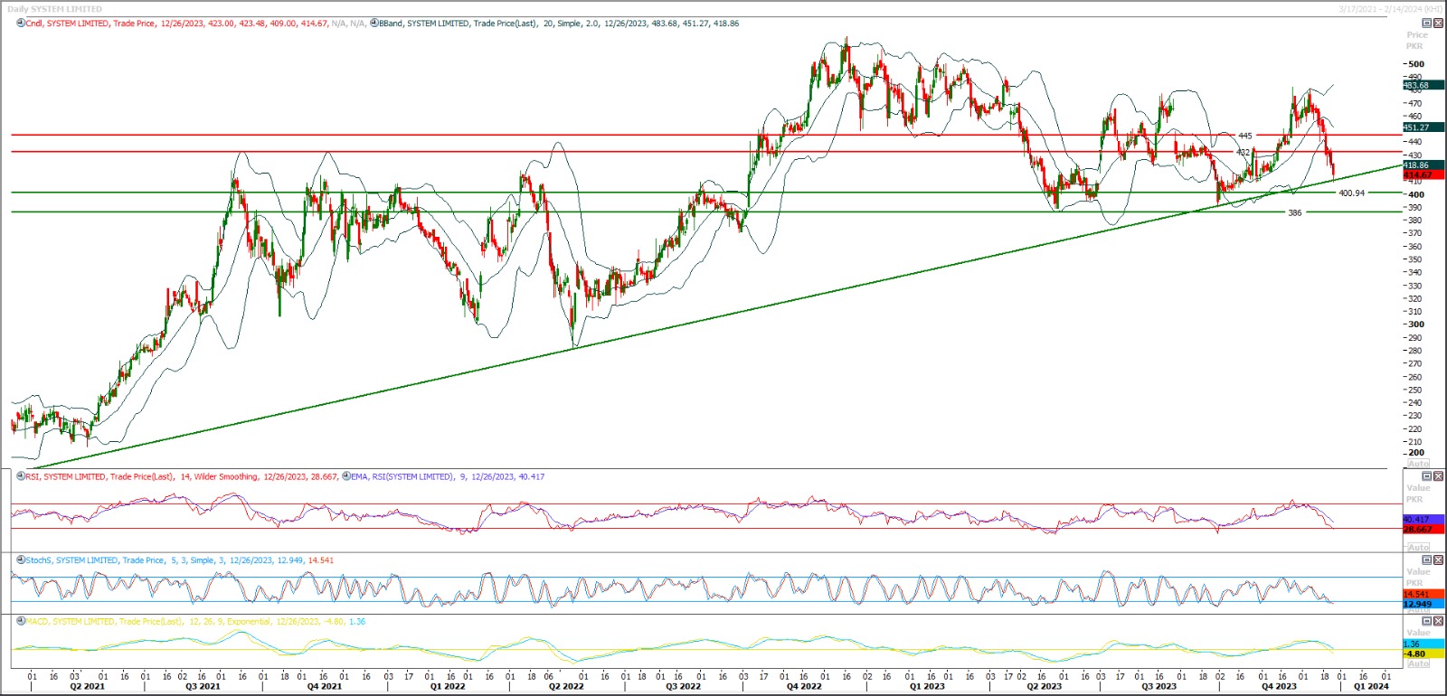 Buy above 400 with strict stop loss of 387 and profit target at 422 with extension towards 444TECH NOTE: SYS is being supported by an ascending trend line along with a horizontal supportive region.