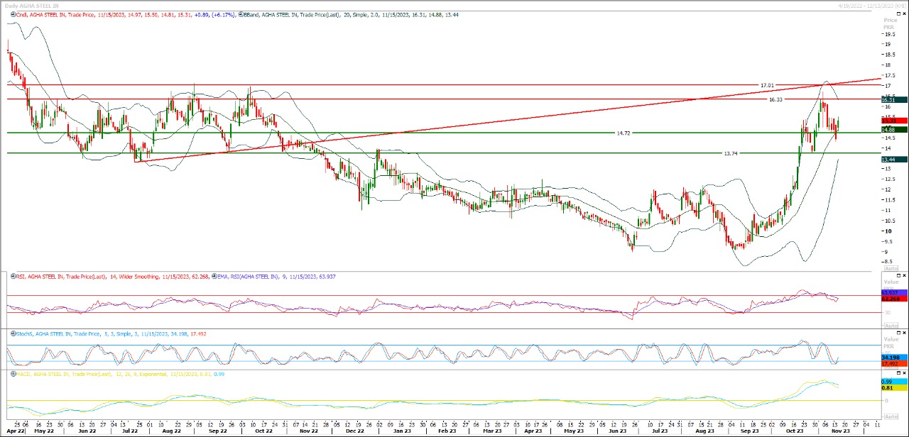 Buy AGHA as long as its trading above 14.65 with strict stop loss of 13.74 and profit target at 16.30 with extension towards 17.00